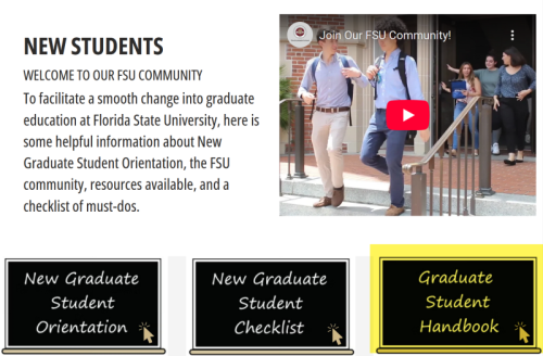 The Graduate Student Handbook --- Scroll down to the New Students section of the page, and click the Graduate Student Handbook tile.